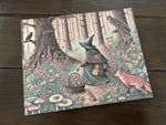 Graceful and commanding, a witch cloaked in filigreed fabric and crowned with blooming roses shares a moment of reverent stillness with her raven messengers. Framed by a garden of soft blush petals and shadowed wings, she embodies the sacred balance between wisdom and wildness. Each feathered companion perches as if mid-conversation, bearing secrets on the wind. Rendered in romantic tones of dusty rose, raven black, and soft parchment, this piece conjures an aura of gentle power and spellbound grace—perfect for those who walk with crows and whisper to the flowers.