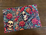 Surrounded by lush florals and vines, and a skull rest peacefully among the blossoms, weaving the ephemeral with the eternal in a tapestry of color, line, and symbol.