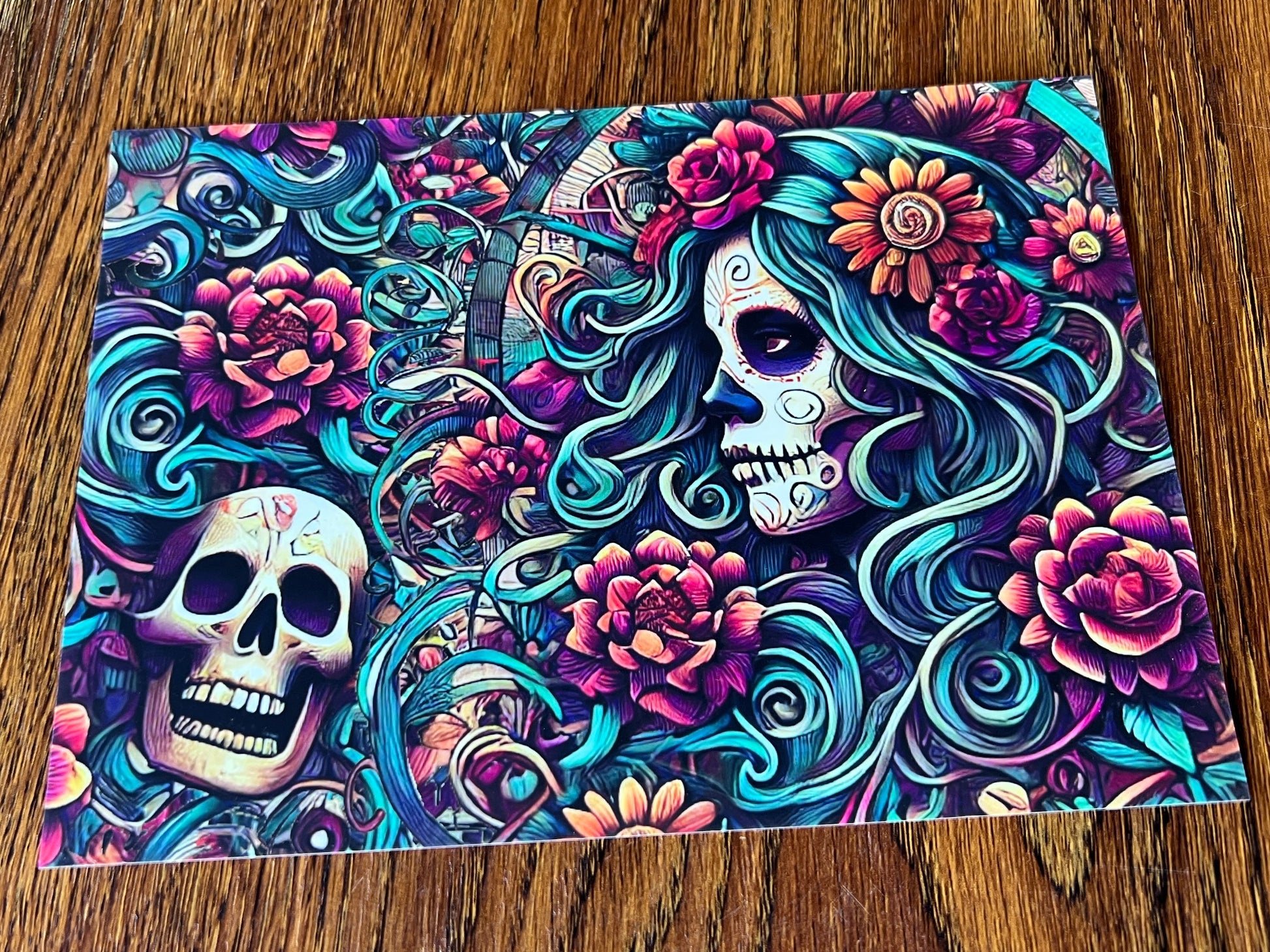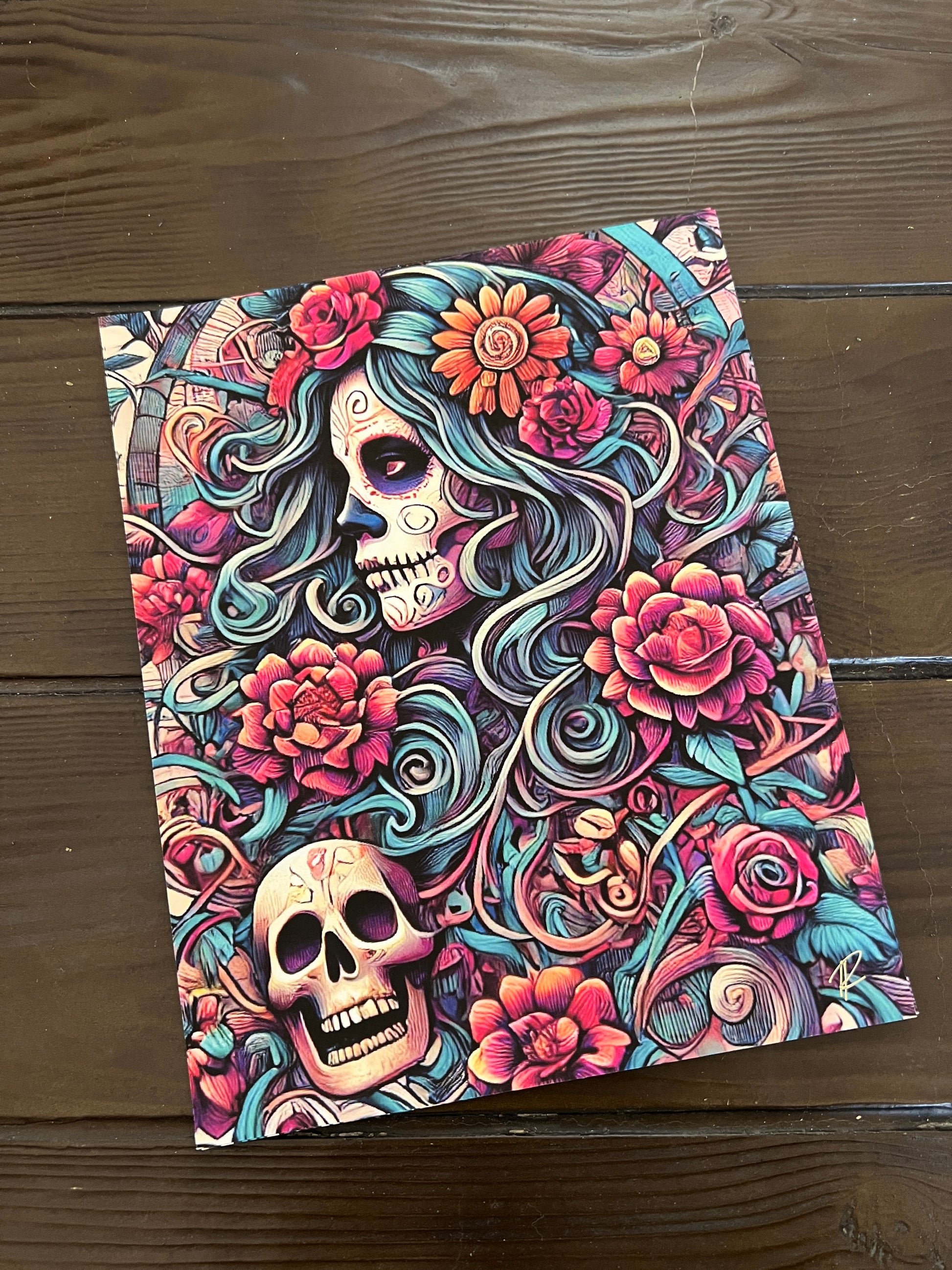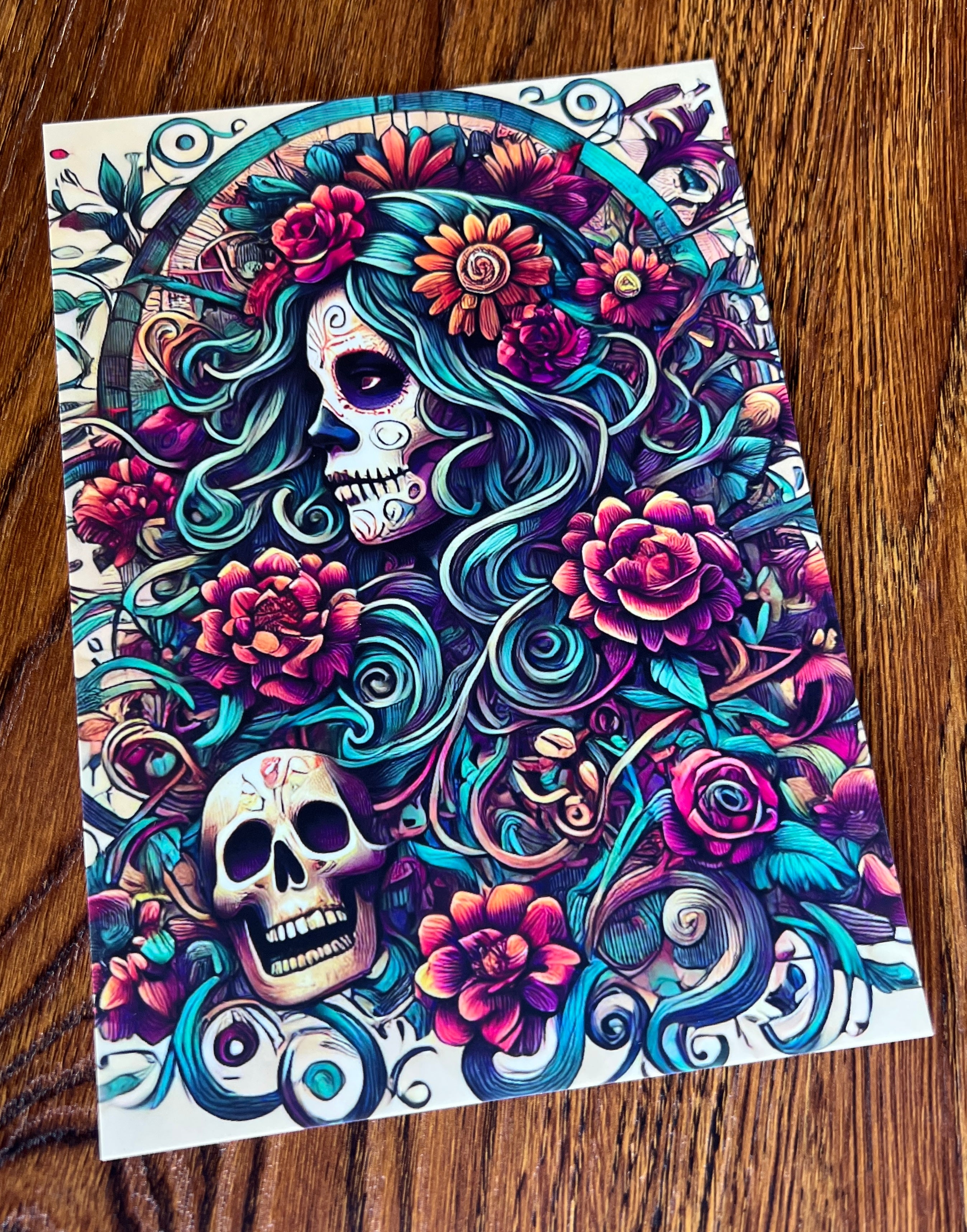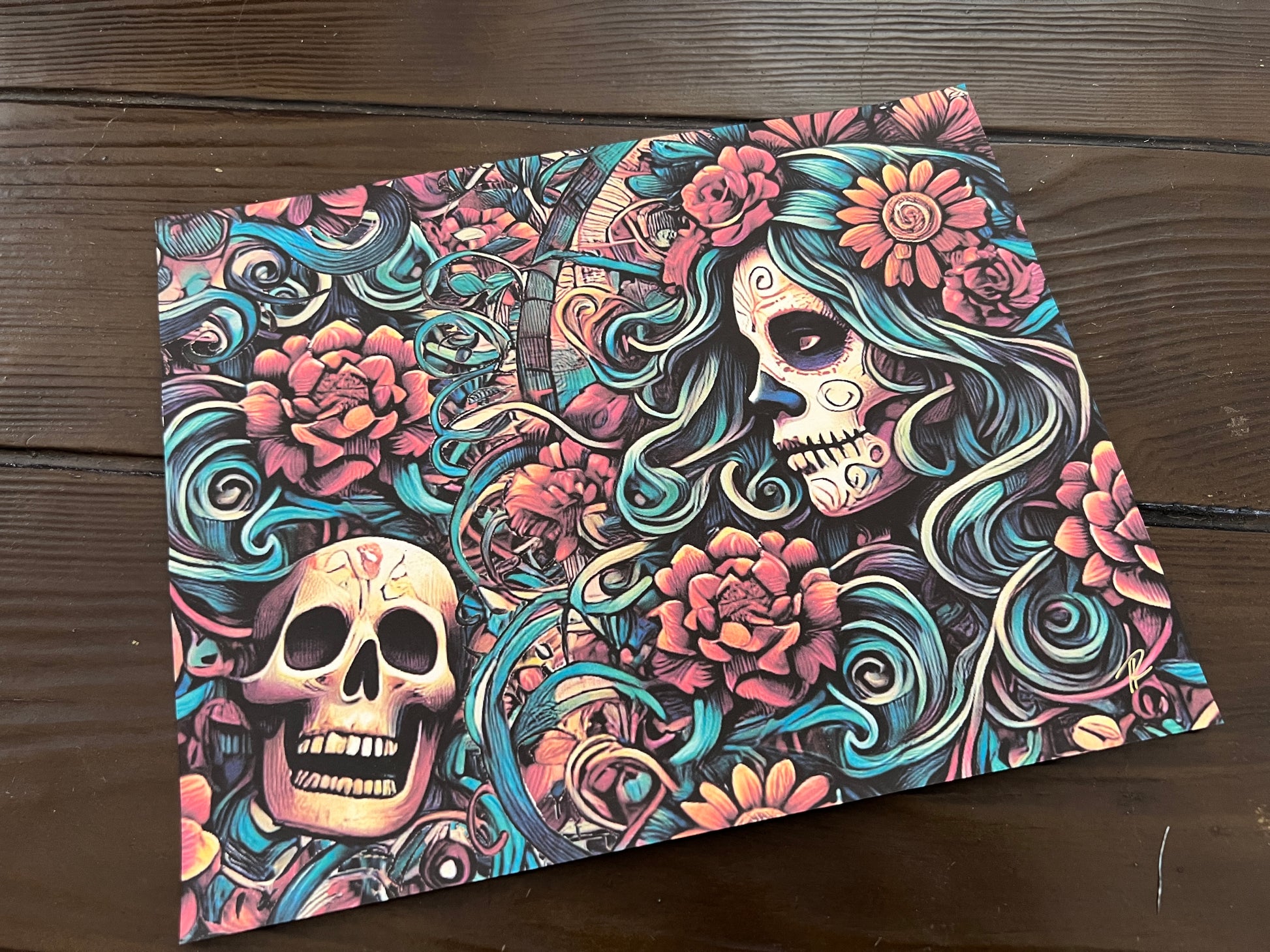 Step into a vivid celebration of life, death, and rebirth with "Santa Muerte in Bloom", a richly detailed art print infused with mysticism and bold botanical elegance. This piece features the iconic Santa Muerte, the sacred feminine embodiment of death, portrayed in a swirling cascade of teal hair and vibrant floral crowns. Her skull is adorned with traditional Día de los Muertos calavera designs, evoking reverence, transformation, and ancestral connection. This can also represent La Catrina or the Day of the Dead.