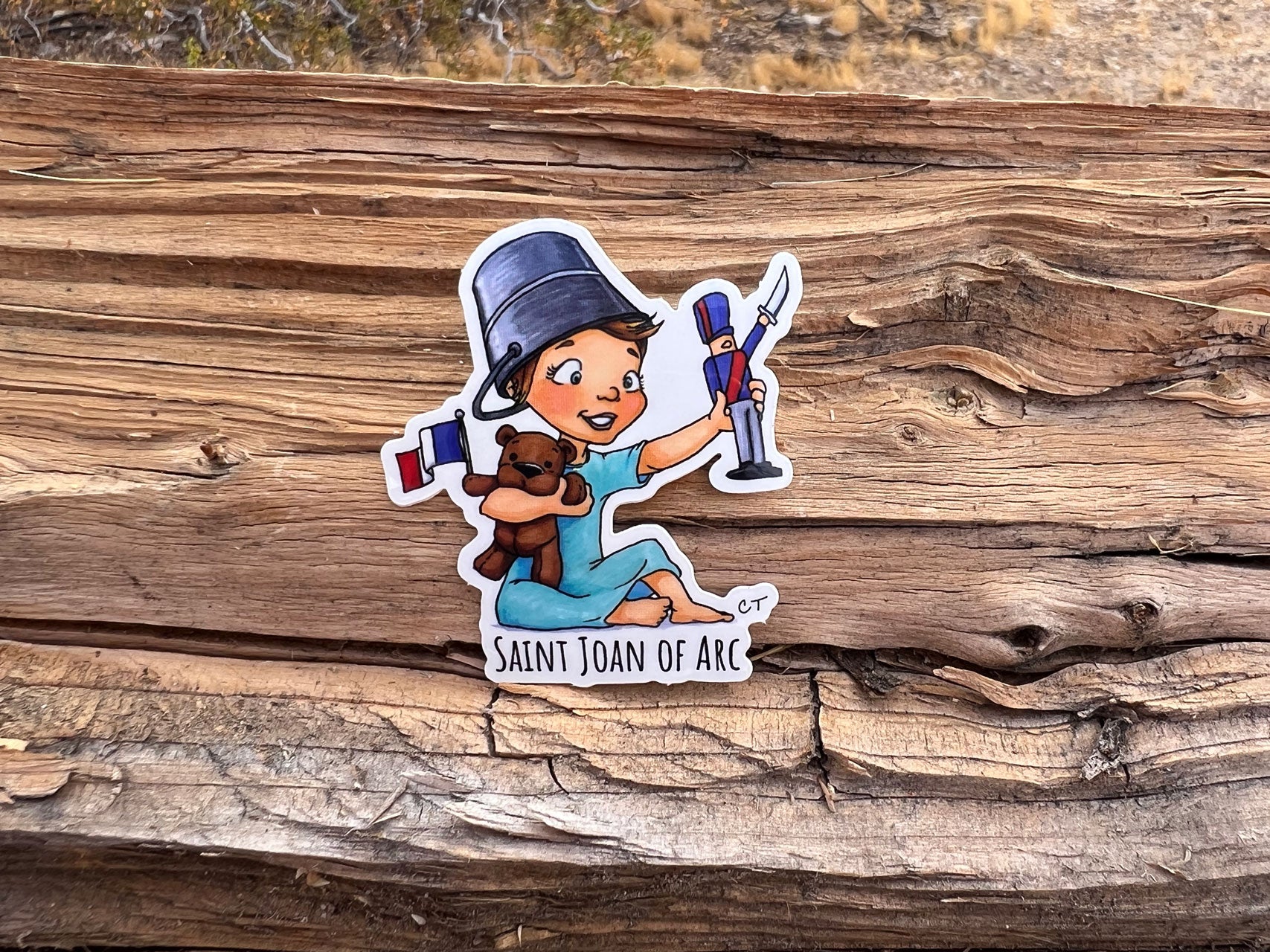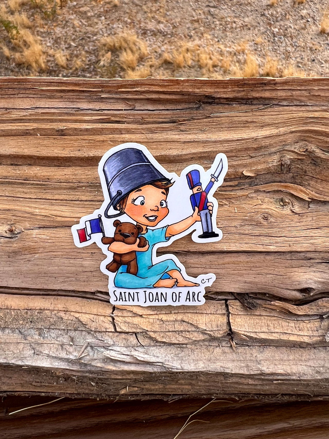 Saint Joan of Arc - Suiting up for imaginary battle with a bucket helmet and plush bear, this feisty heroine waves a French flag with pride and courage. A playful nod to the patron saint of rebels and dreamers with backyard kingdoms to defend. Patron saint of France, soldiers, captives, and those who face ridicule for their faith. She is also a patron of the armed forces and the Women's Army Corps, as well as a symbol of patriotism and bravery.