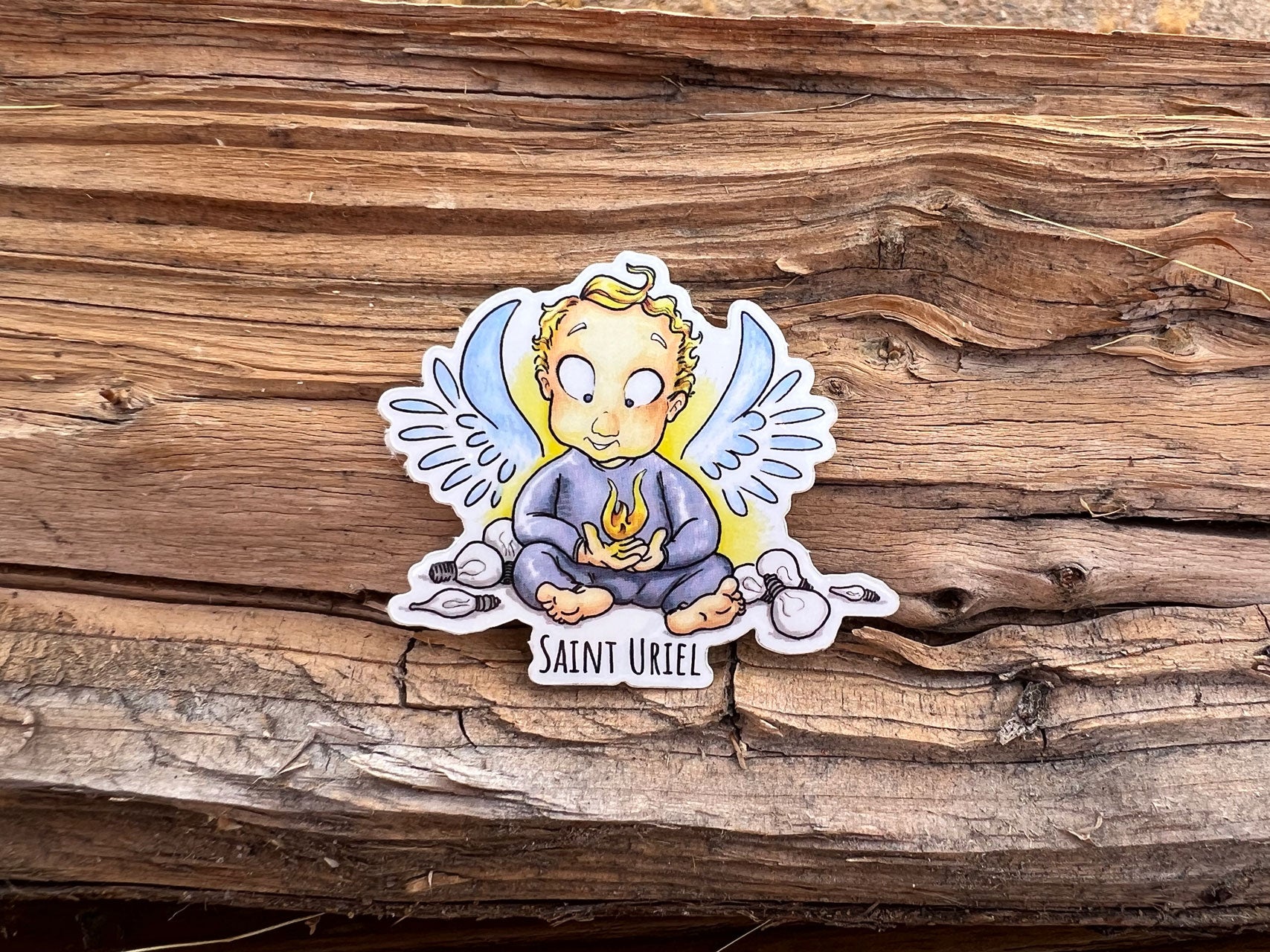 Saint Uriel - A cherubic figure of radiant calm, Saint Uriel cradles a flame of divine knowledge between tiny hands. Light bulbs surround him like broken halos, a reminder that true illumination glows from within. A baby angel with bright ideas and even brighter vibes. Patron saint of the arts and sciences, poets, truth, particularly recognized for his association with divine wisdom and inspiration. He is also considered the patron of the Sacrament of Confirmation in Catholicism and is invoked for spiritual guidance and intellect.