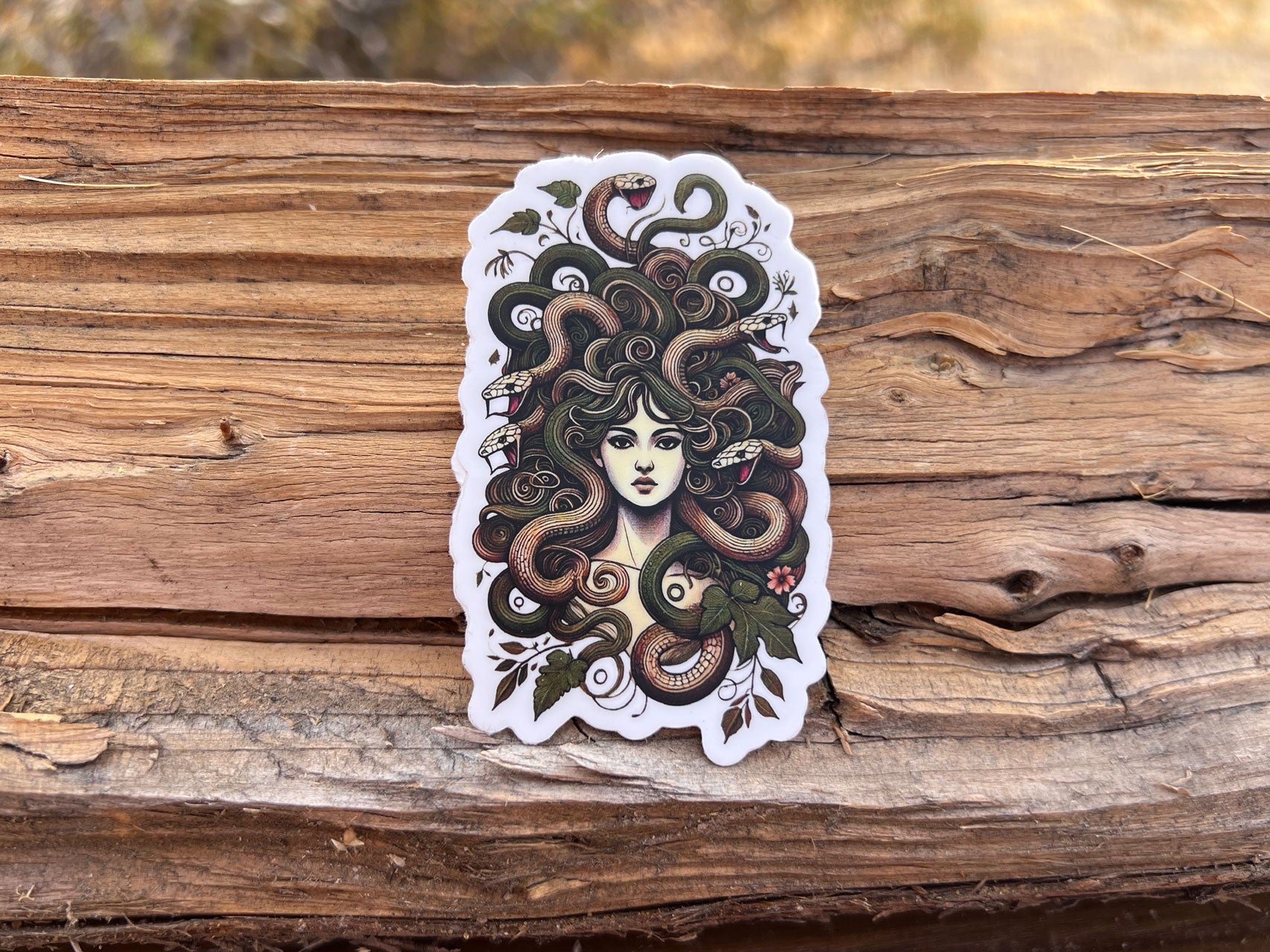 An elegant and eerie Medusa adorned in a regal crown of serpents and foliage. Her gaze is both deadly and divine, framed by coiled power and botanical beauty. Ideal for gothic goddesses, divine feminists, and fans of myth with bite.