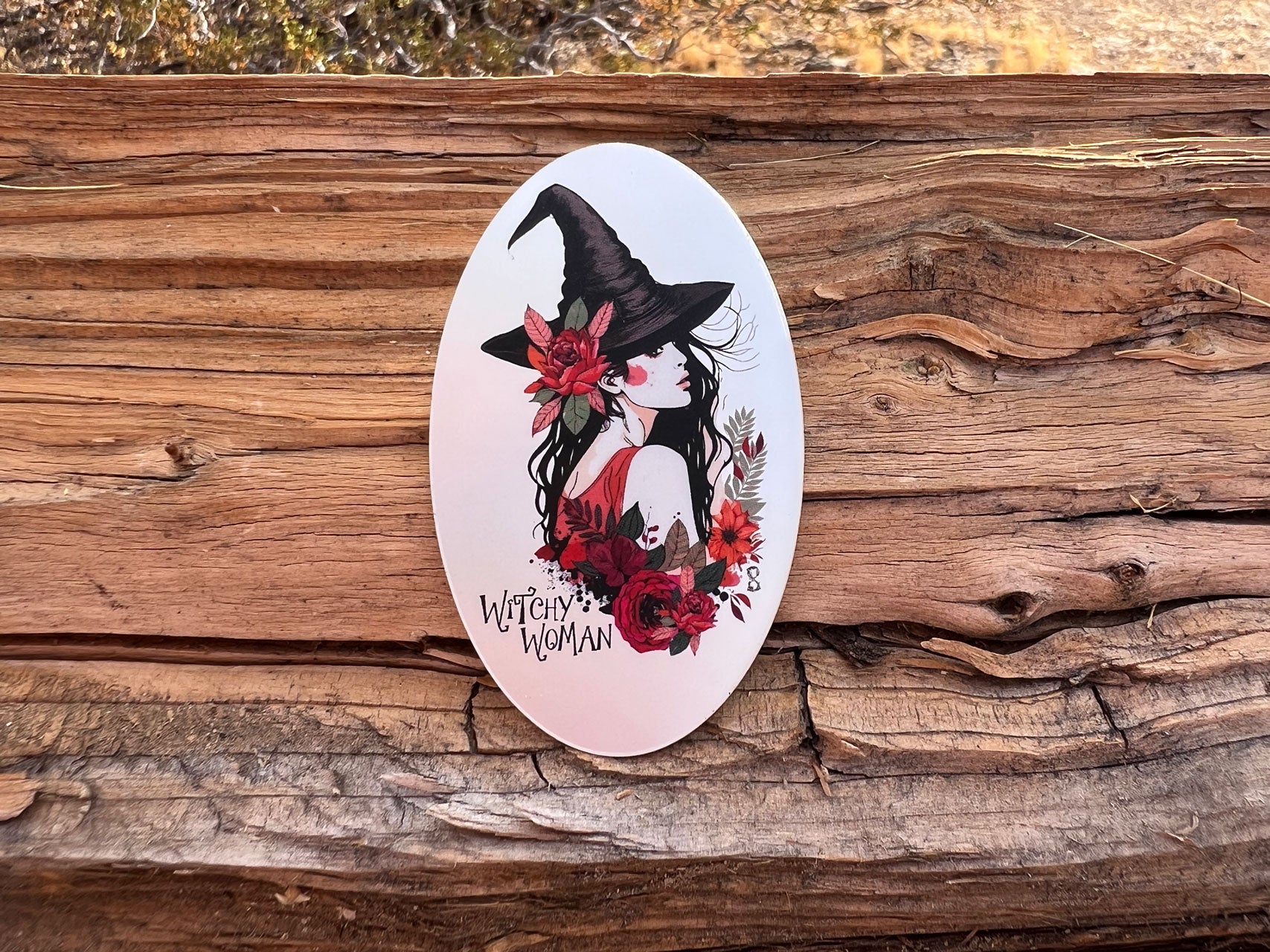 A soft, sultry witch with windswept hair and crimson florals. She looks over her shoulder with a knowing glance, draped in petals and mystery. Sophisticated with just enough seduction—classic witchy charm.