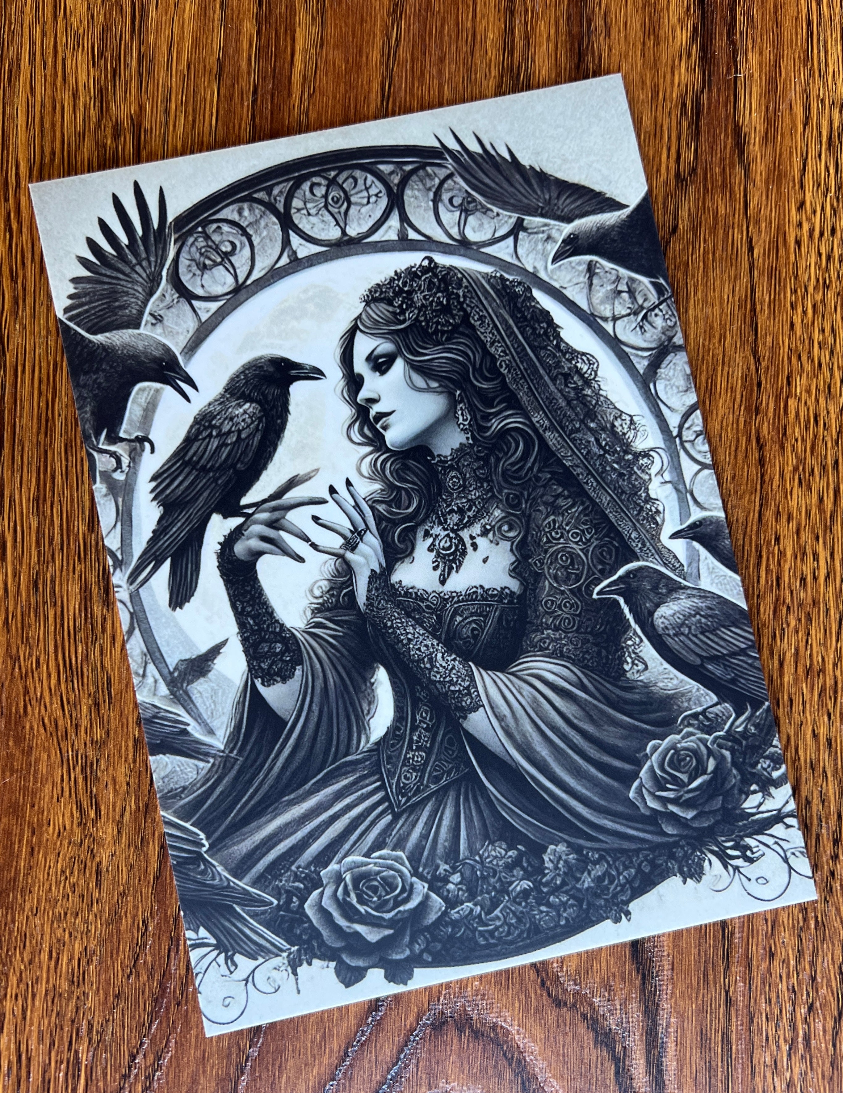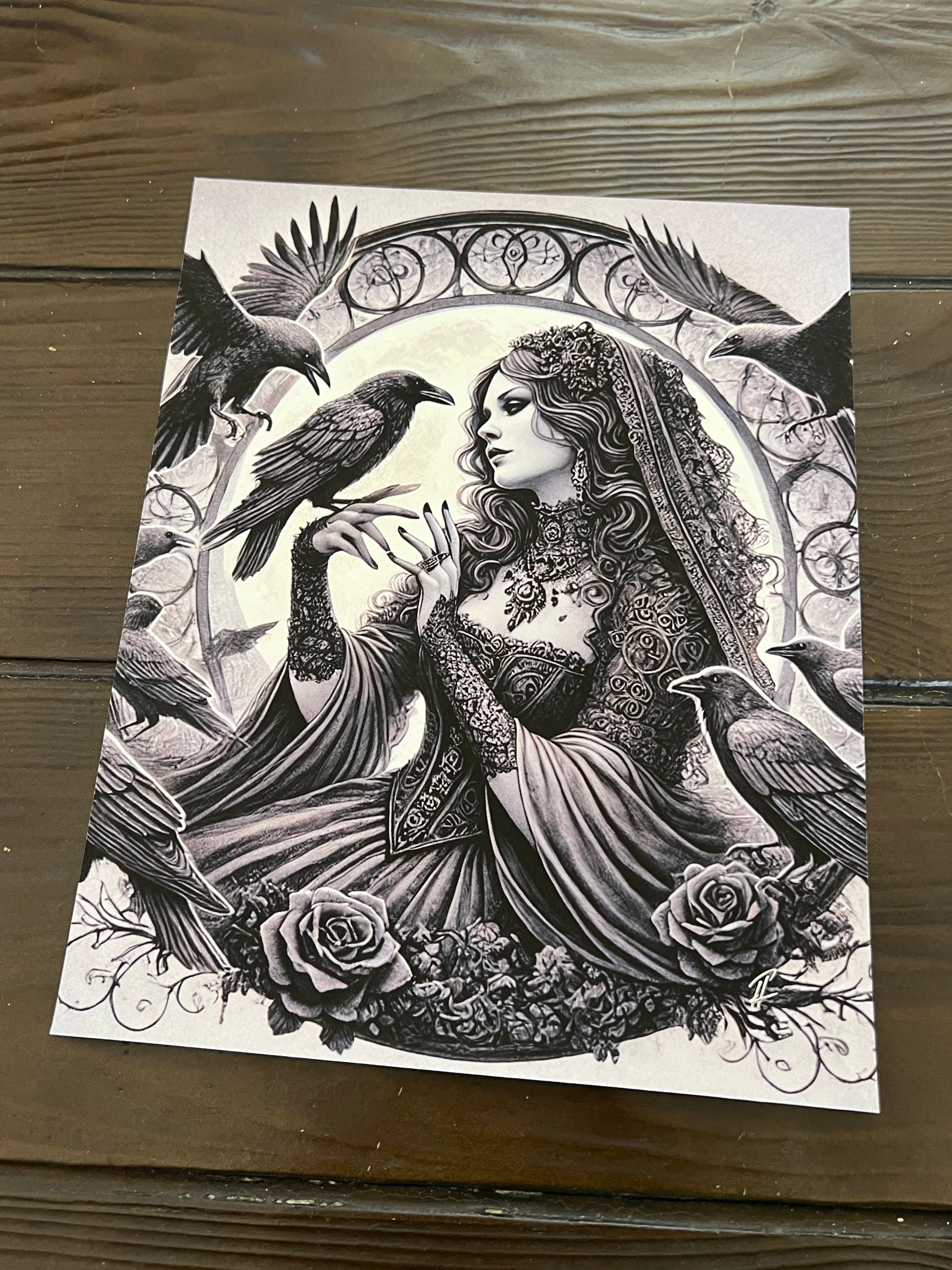 A gothic enchantress draped in ornate lace and midnight whispers sits poised beneath a full moon, cradling the mysteries of the ravens perched upon her delicate hands. Her gaze is timeless, regal, and haunting—echoing the old-world romance of sorrow and spellcraft. Monochrome roses bloom at her feet, their petals unfurling secrets, while a wrought-iron arch etched with ancient sigils curves above like a portal to another realm. This black and moonlit piece is rich with symbolism—perfect for those who dance between shadows, revere raven familiars, or cherish the elegance of the macabre.