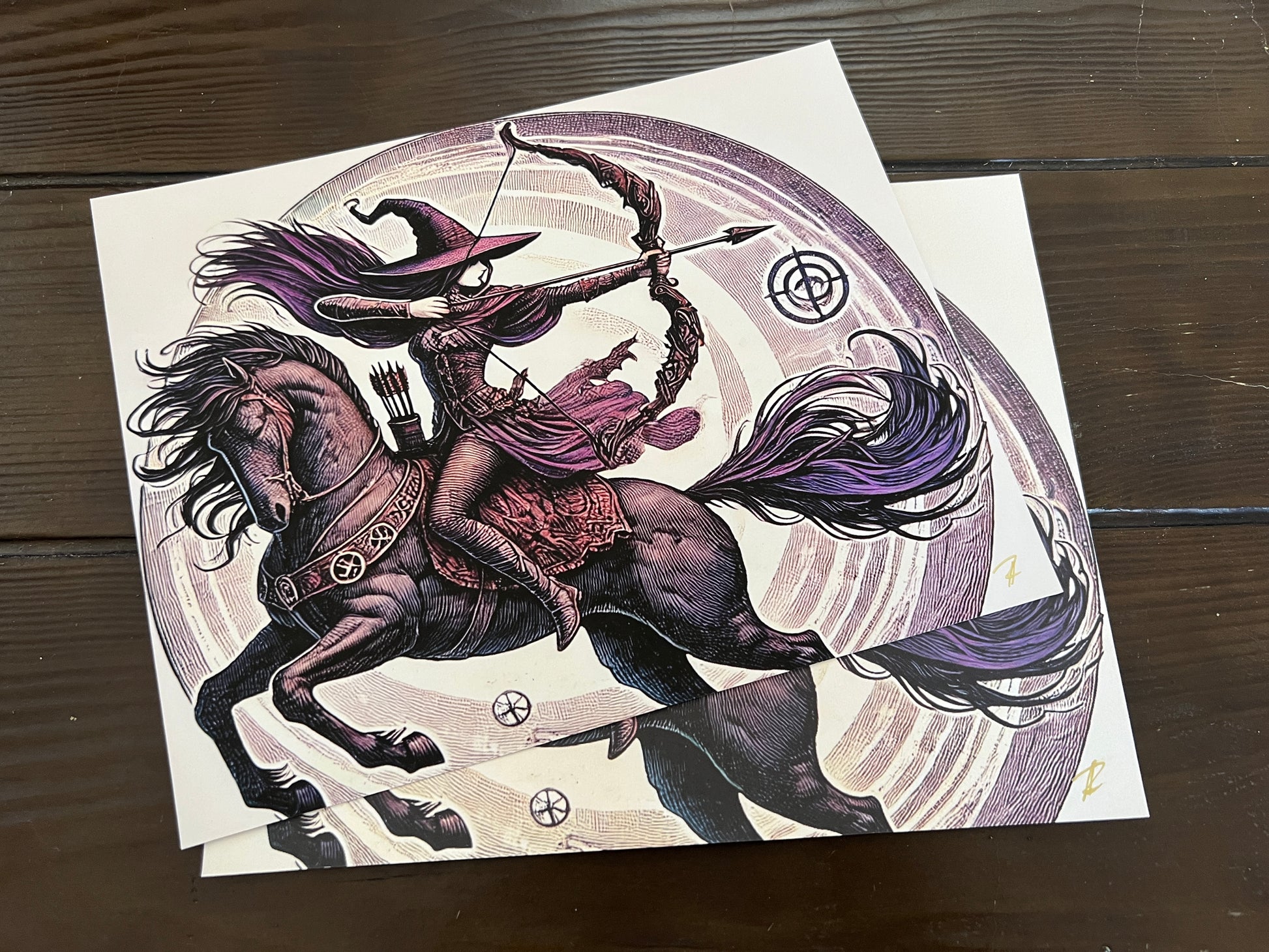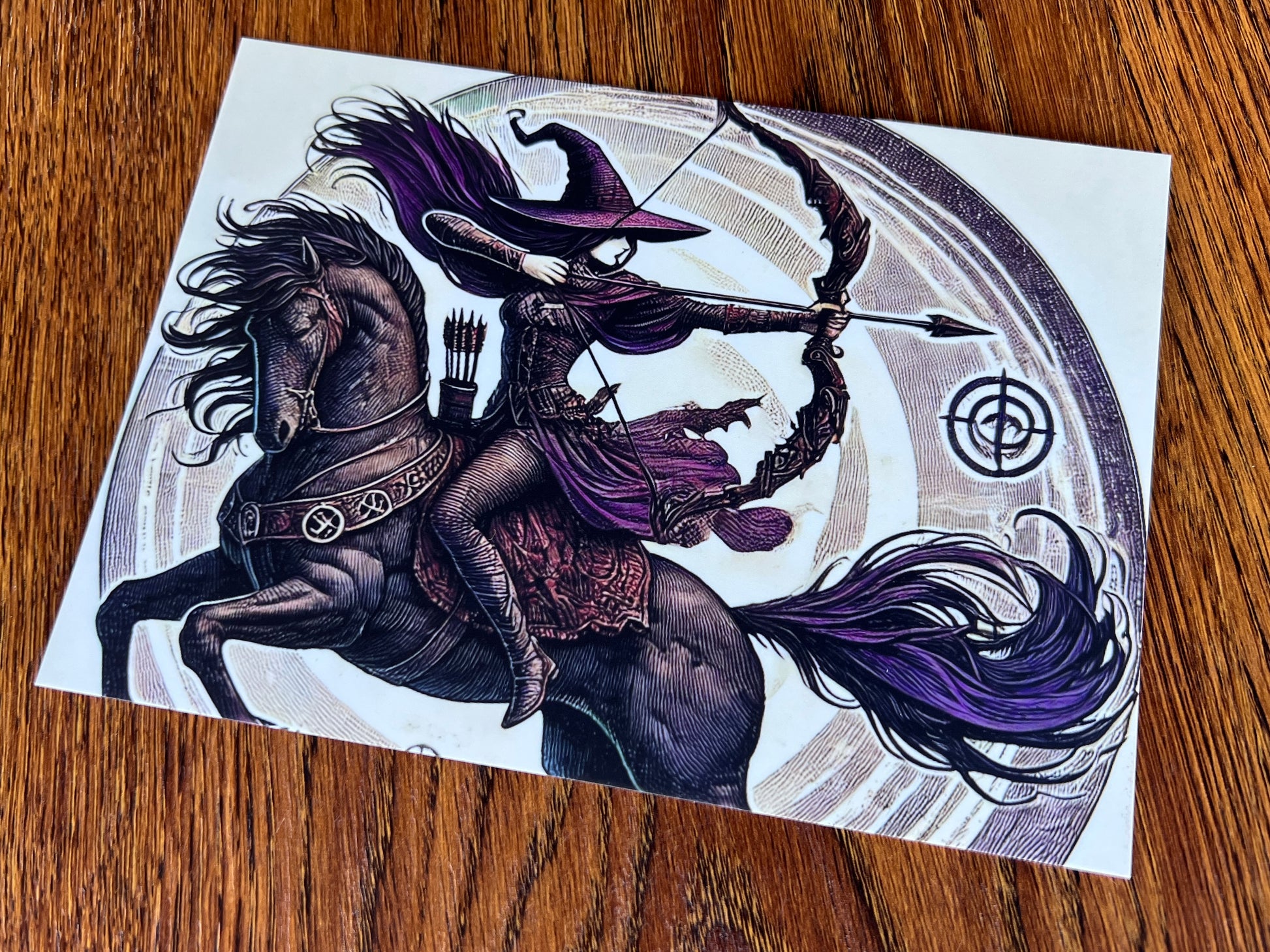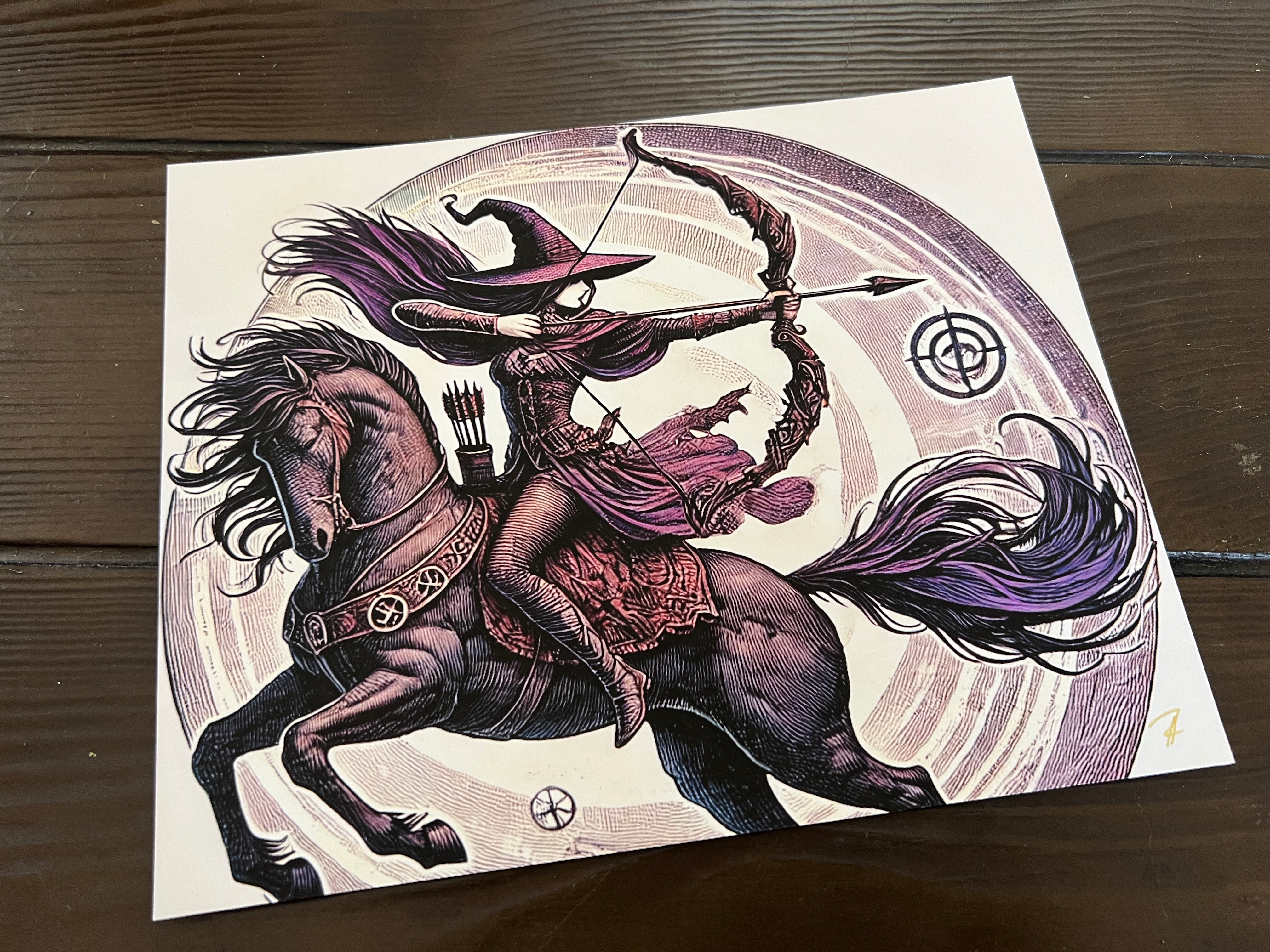 In a whirlwind of power and purpose, a witch archer charges forward on a mighty steed, bow drawn and heart aligned with her mark. Her deep plum cloak and windswept hair trail behind like the tail of a comet, echoing the spiraling energy that surrounds her. The horse beneath her gallops with unwavering strength, etched with protective runes and guided by the magic of motion. Spirals of Spirit radiate outward, drawing the eye to her arrow—poised in perfect balance between focus and flight. A stirring tribute to determination, wild freedom, and the sacred art of hitting your true target.