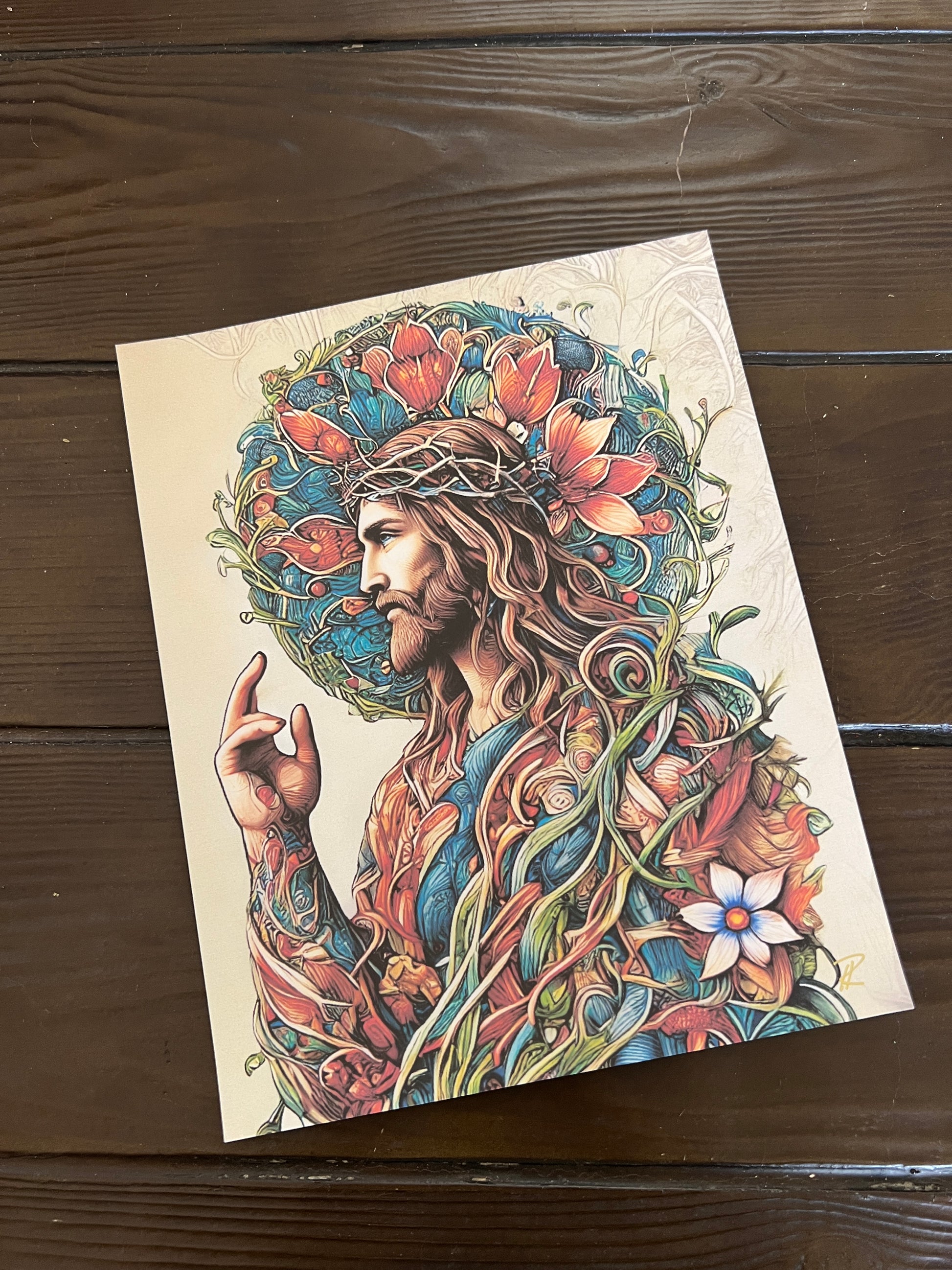 This radiant depiction of Christ raises a hand in gentle blessing as vines and flowers curl through his robes and crown, symbolizing the eternal life and flourishing spirit he offers. Encircled by a halo of blooming lilies and sacred geometry, this artwork celebrates the divine as a living force within nature. The image is both regal and intimate, offering a sense of quiet miracle and spiritual blooming.