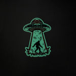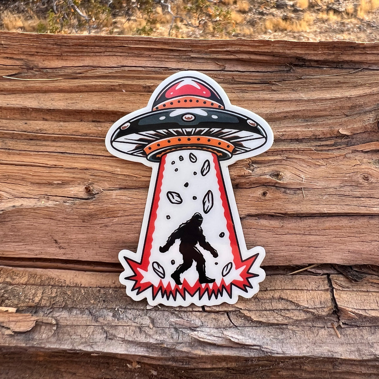 Sasquatch doesn’t believe in aliens—until he’s abducted. Beamed up in a comic-book style ray of light and autumn leaves, this sticker is perfect for cryptid lovers, conspiracy theorists, cosmic wanderers and glow-in-the-dark fans.