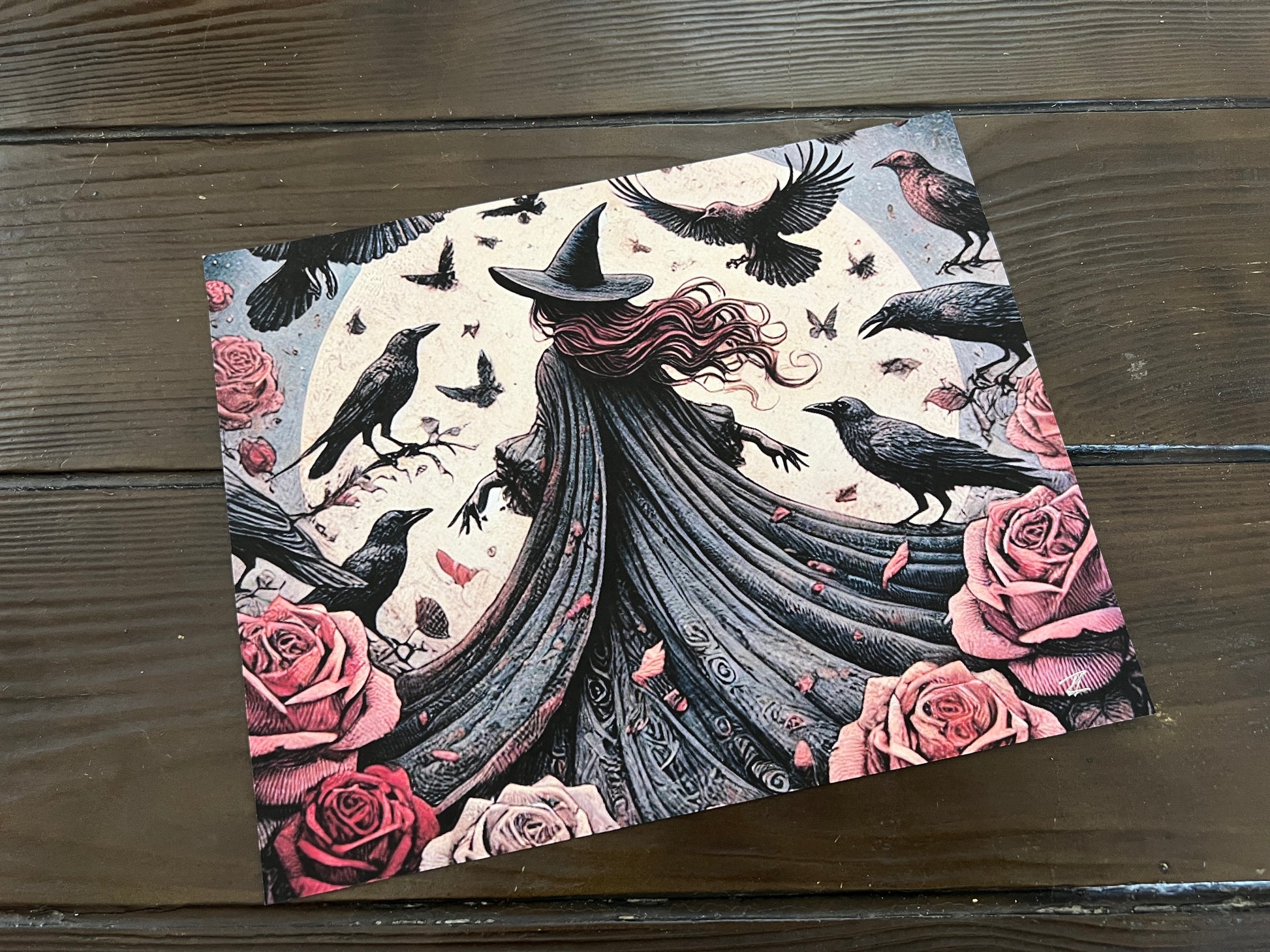 A spellbound witch sweeps across a moonlit sky, her flowing cloak stitched with arcane secrets and whispered shadows. Surrounded by a flurry of crows, petals, and rising dusk, she moves between realms—part omen, part enchantress. Deep crimson roses bloom at her feet, their velvet petals a striking contrast to the swirling night. Rendered in dark, romantic hues of blush, charcoal, and bloodwine, this gothic tale captures the mystique of transformation, flight, and feminine power. Ideal for lovers of dark fantasy, raven familiars, and the haunting beauty of twilight magick.