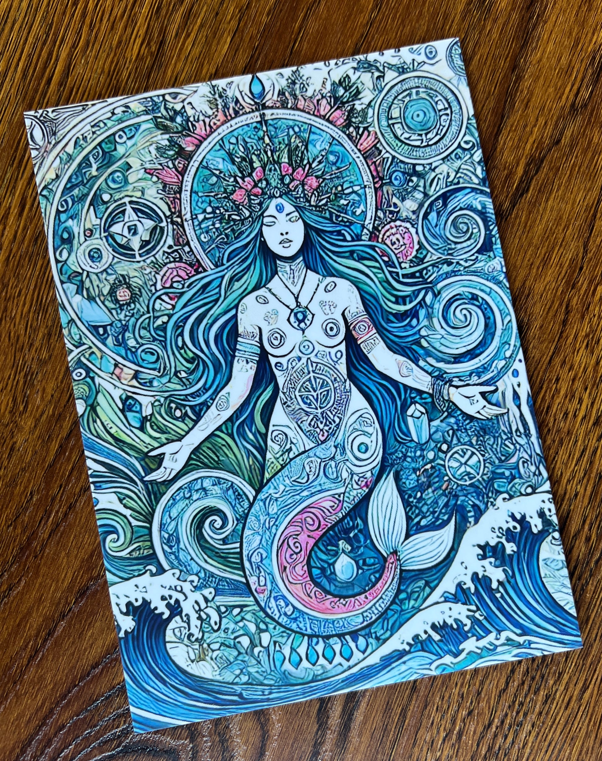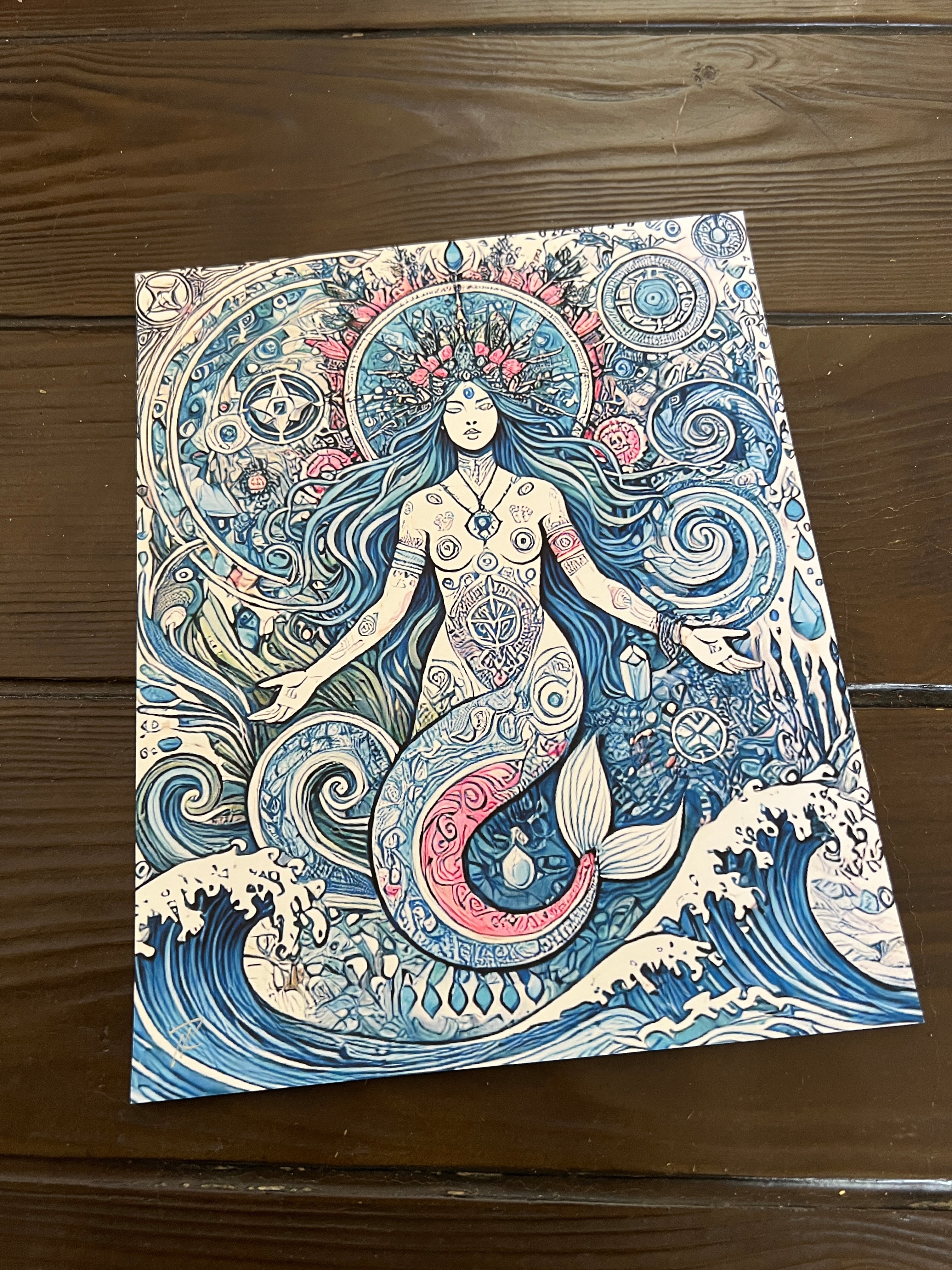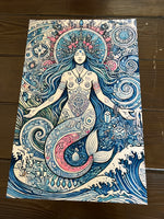 Dive into the sacred waters of divine feminine power with this intricate, oceanic homage to Yemayá, the Orisha of the sea, creation, and motherhood. Adorned in sacred symbols and crowned in coral and starlight, this celestial mermaid goddess flows with the wisdom of tides and moon phases. Her tail coils with swirling sigils and waves, surrounded by seashells, constellations, and sacred geometry. Rendered in deep ocean blues, seafoam teals, and soft corals, the artwork pulses with mysticism, healing, and ancient magic. A stunning tribute for ocean witches, spirit workers, and anyone attuned to the sacred rhythms of water and creation.