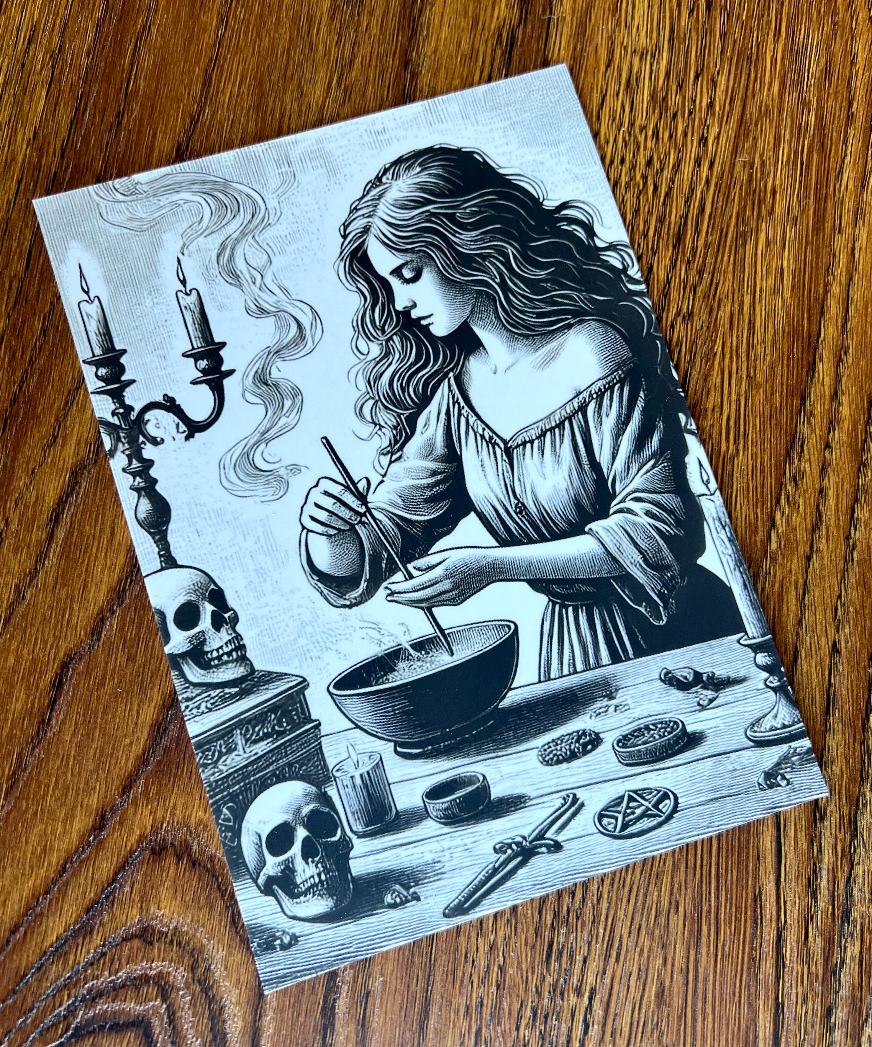 This moody grayscale illustration invites you into the heart of spellwork—a candlelit wooden table, mid-stir, skulls silently observing the ritual. A young witch, sleeves rolled and eyes focused, channels ancient power into her brew. Richly detailed with pentacles, potions, and powdered ingredients, this print is a love letter to the sacred art of brewing.